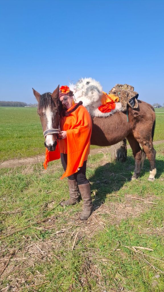 Op deze markt verenigen de handelaren zich in het Marskramers gilde. Hoewel we op het pad vaak eenzaam zijn, komen we hier samen. Daar waar we oude vrienden ontmoeten en nieuwe vrienden maken. We eten, drinken, lachen en bespreken handelstactieken. Maar het allerbelangrijkst is natuurlijk dat we onze inkopen doen op deze oranje markt. Het is een wonder hoe de grote hoeveelheid uitpuilende spullen niet uit de kar vallen. Volgeladen en vol goede moed gaan we weer op pad. Je weet immer nooit wanneer wie wat nodig heeft.