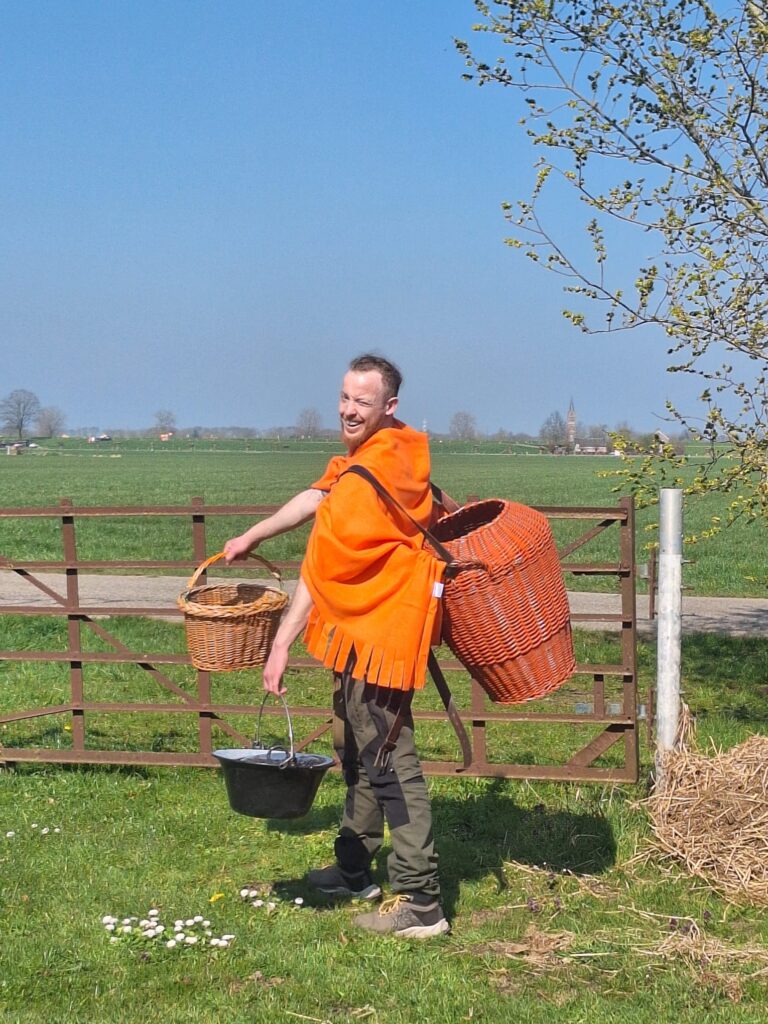 Robin is helemaal in kannen en kruiken met zijn potten en pannen. Je hoort hem al van verre aankomen. De pannen maken hun eigen melodie wanneer ze tegen zijn rugzak klingelen. Zijn rugzak kent vele extra vakken waar voor iedere situatie wel een handigheidje in te vinden is. Zijn vaste uitdrukking: “Op ieder potje past een dekseltje!”. Is het een muzikant, of zit er wat anders in zijn mand?